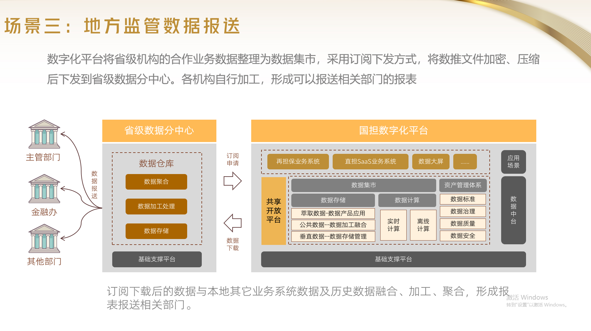 元明科技副總經(jīng)理王開燦重點(diǎn)介紹了“國擔(dān)基金省分中心方案”,他表示,省數(shù)據(jù)分中心技術(shù)架構(gòu)與國擔(dān)基金直擔(dān)SaaS平臺(tái)一脈相承,按照“互聯(lián)網(wǎng)+擔(dān)?!钡脑O(shè)計(jì)理念,將進(jìn)一步擴(kuò)大數(shù)字化平臺(tái)的開放程度,通過“1+2+N”的數(shù)字化生態(tài)平臺(tái),將有效實(shí)現(xiàn)央地?cái)?shù)據(jù)中臺(tái)互聯(lián)互通和數(shù)據(jù)共享,實(shí)現(xiàn)地方監(jiān)管數(shù)據(jù)對(duì)接、銀擔(dān)系統(tǒng)直連、業(yè)財(cái)對(duì)接等個(gè)性化需求和屬地化需求,將有力提升公司和合作機(jī)構(gòu)的精細(xì)化管理水平及風(fēng)險(xiǎn)防控能力。